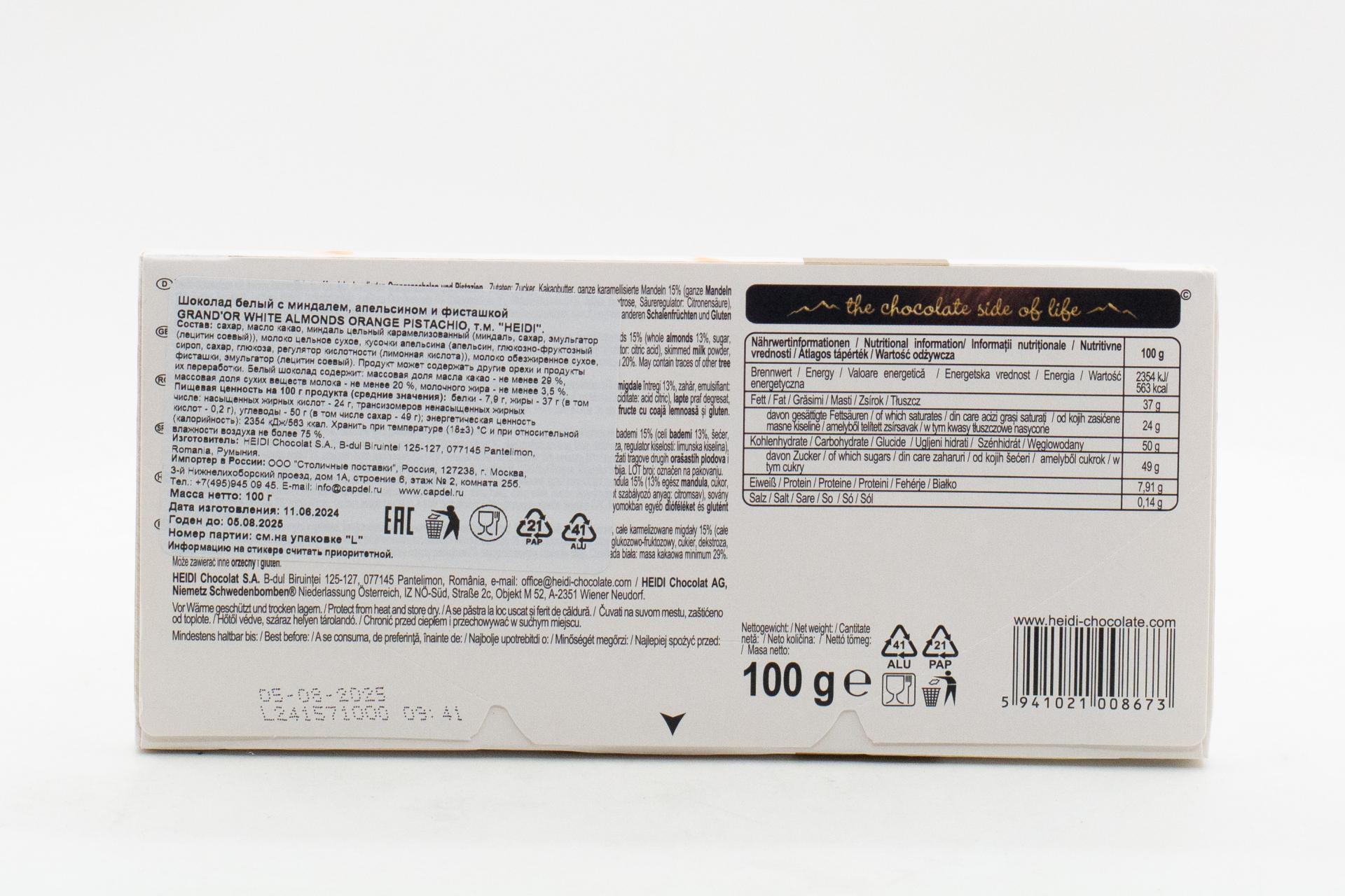 Шоколад HEIDI Chocolat S.A. GRAND'OR WHITE ALMONDS ORANGE PISTACHIO (Белый с миндалем, апельсином и фисташкой) 100гр257,56 руб. за штуку (в упак. 15 шт.) |